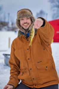 The water is about 7-9 feet deep (with the ice typically being over 15 inches thick). This water depth is great for many types of species – most common catches are Pike, Perch, and Crappie. There are Walleye (pickerel) as well, but less common.